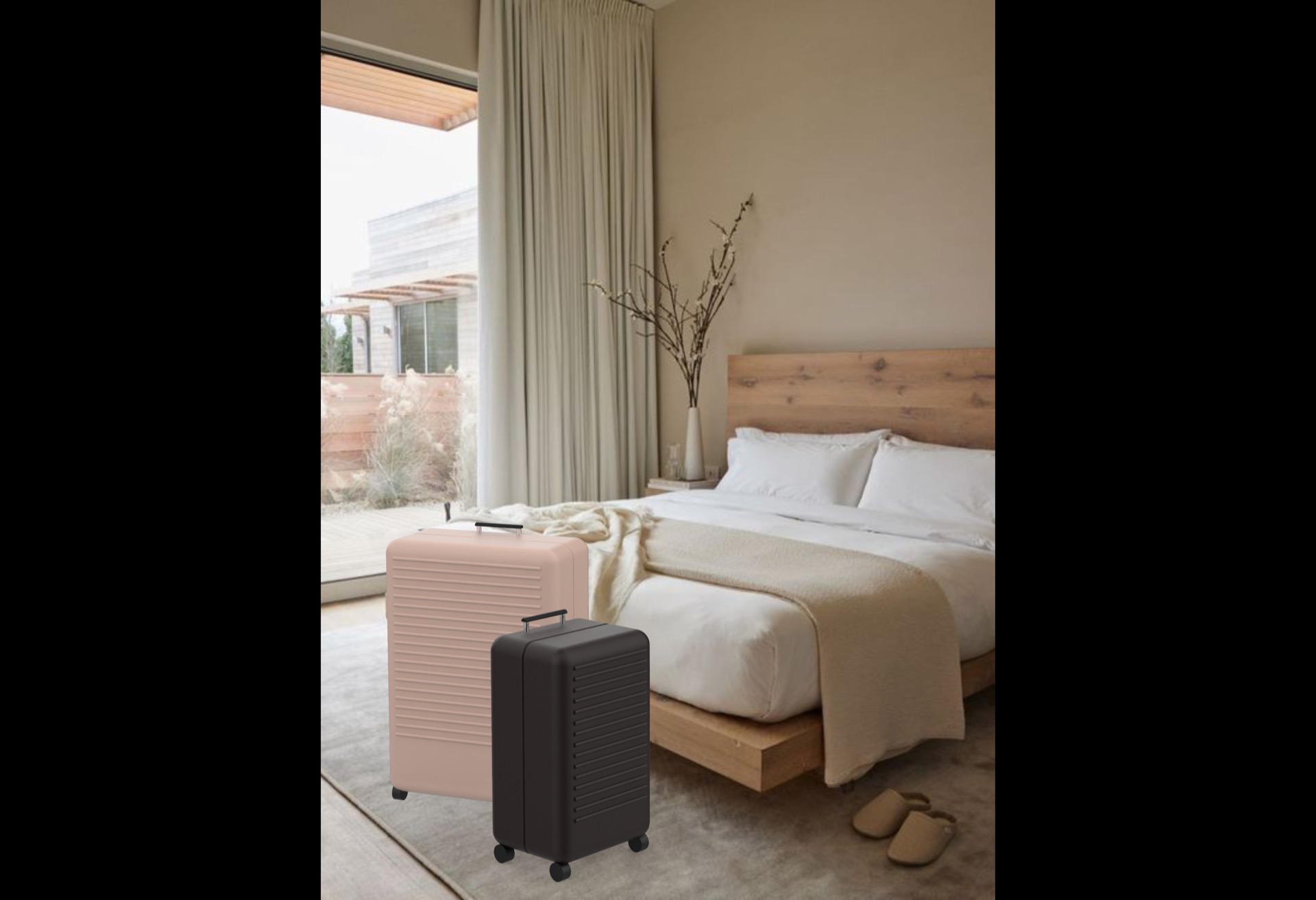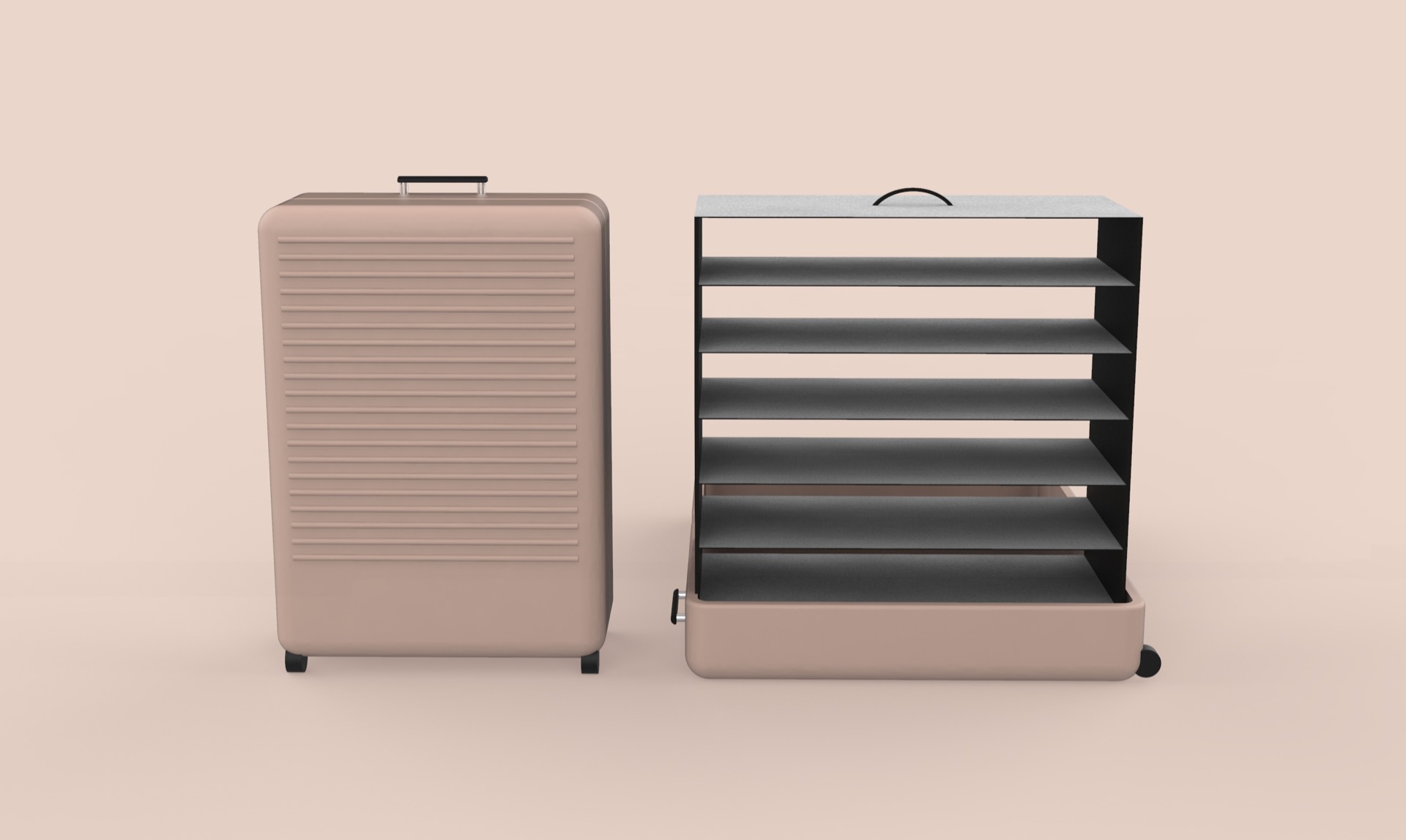 Mala de porão com múltiplos compartimentos, projetada para se transformar rapidamente em um armário versátil.
